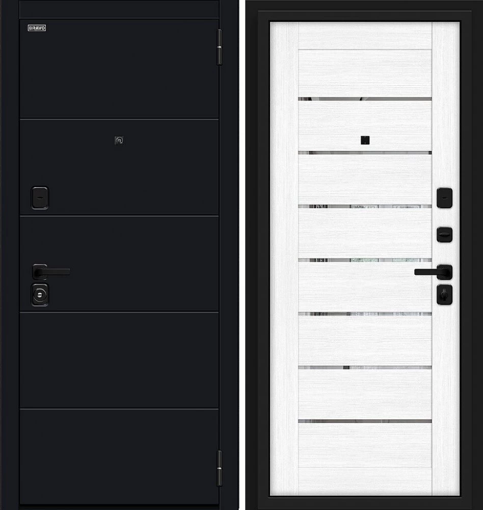 Надежная входная Дверь Браво Прайд Total Black/Snow Melinga премиум класса по цене 39 633 руб. Большая толщина стали защитит от проникновения в ваш дом, квартиру или коттедж. Используется очень качественная фурнитура: замки, цилиндры, ручки, защелки. Покрытие и отделка двери изготовлено под внимательным контролем производителя. Дверь имеет долгий срок службы и гарантию.