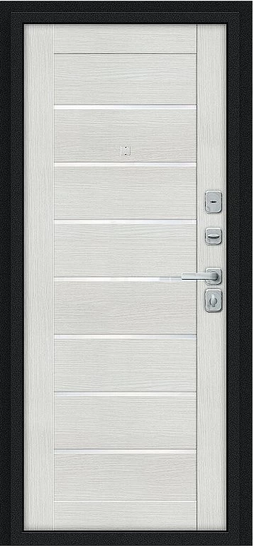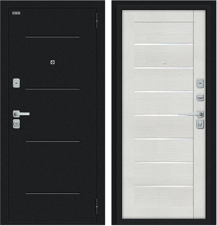 Надежная входная Дверь Браво Техно/BChrome Букле черное/Bianco Melinga премиум класса по цене 34 783 руб. Большая толщина стали защитит от проникновения в ваш дом, квартиру или коттедж. Используется очень качественная фурнитура: замки, цилиндры, ручки, защелки. Покрытие и отделка двери изготовлено под внимательным контролем производителя. Дверь имеет долгий срок службы и гарантию.