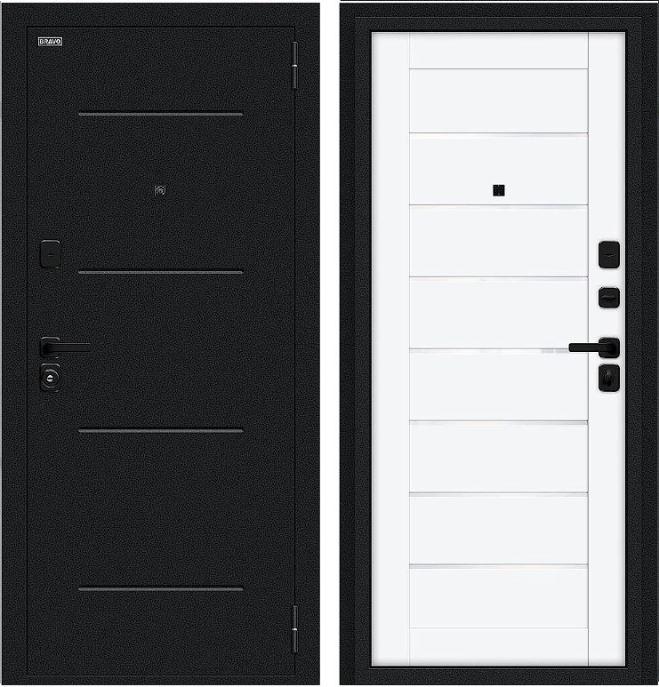 Надежная входная Дверь Браво Техно/SBlack Букле черное/White Silk премиум класса по цене 33 233 руб. Большая толщина стали защитит от проникновения в ваш дом, квартиру или коттедж. Используется очень качественная фурнитура: замки, цилиндры, ручки, защелки. Покрытие и отделка двери изготовлено под внимательным контролем производителя. Дверь имеет долгий срок службы и гарантию.